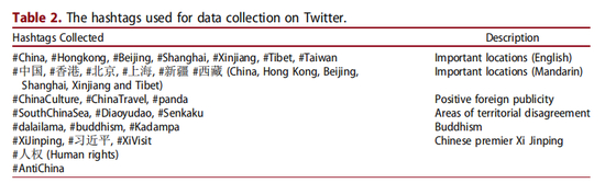 同时,研究还选取了来自推特平台的数据。两位学者统计了2017年1月24日到2月5日期间最常使用的27个与中国相关的标签。并根据这些标签,选取了2017年2月21日到4月8日期间使用其中任何一个标签发布的帖文。