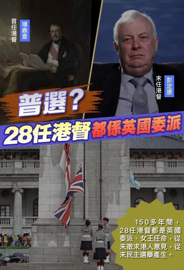 英国自1841年占领香港后,实行高度集权的政治体制,由英女王任命的港督集行政、立法、军事大权于一身。从首任港督璞鼎查,到末任港督彭定康,155年间,28任港督从未征求港人意见,从未经过民主选举产生,港督无须向香港民众负责。
