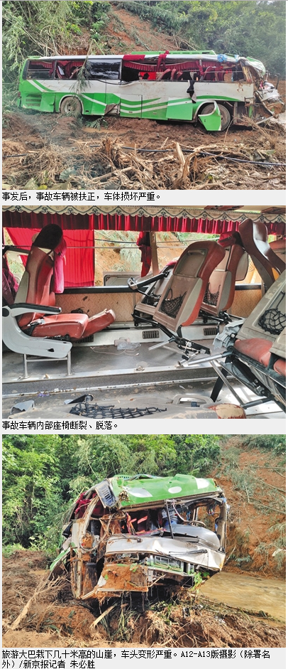 山下数十米处,白绿相间的旅游大巴车身上仍沾满泥土。