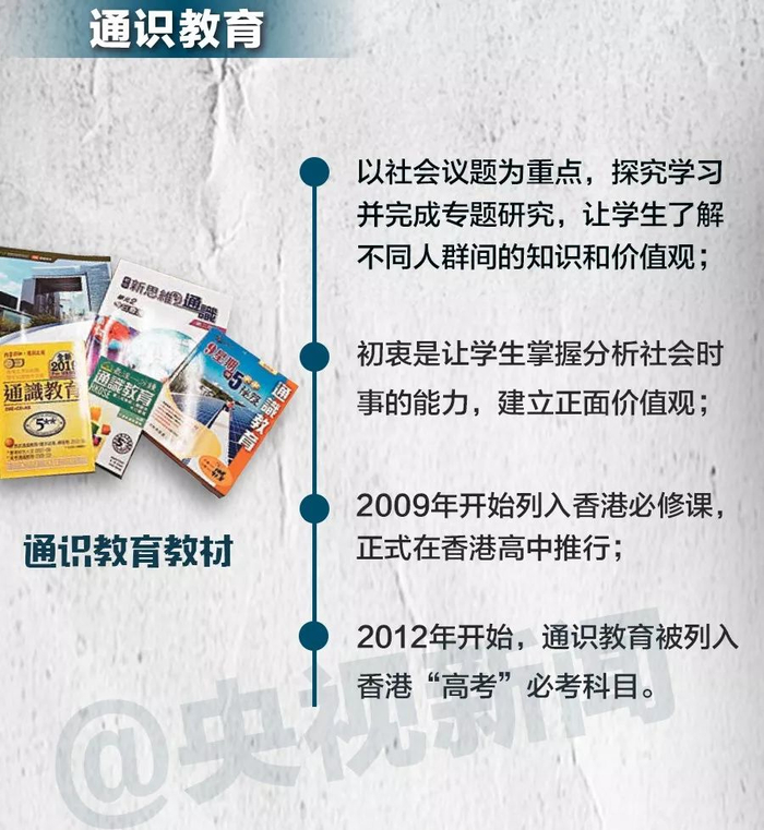通识教育是香港“高考”(HKDSE)核心科目,涵盖经济、文化、历史、科学等诸多范畴。课纲与社会时事相关联,教师可编写教材。由于通识教育没有课本送审制度,市面上不少“教科书”曾被揭发存在偏颇或错误内容,包括污名化“一国两制”、美化反对特区政府行动、煽动青少年违法等。部分教科书甚至由反对派人士主编。