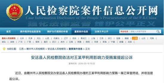 据人民检察院案件信息网披露,3月,由赣州市人民检察院交办安远县人民检察院办理的王某甲利用影响力受贿一案已审查终结,并依法提起公诉。