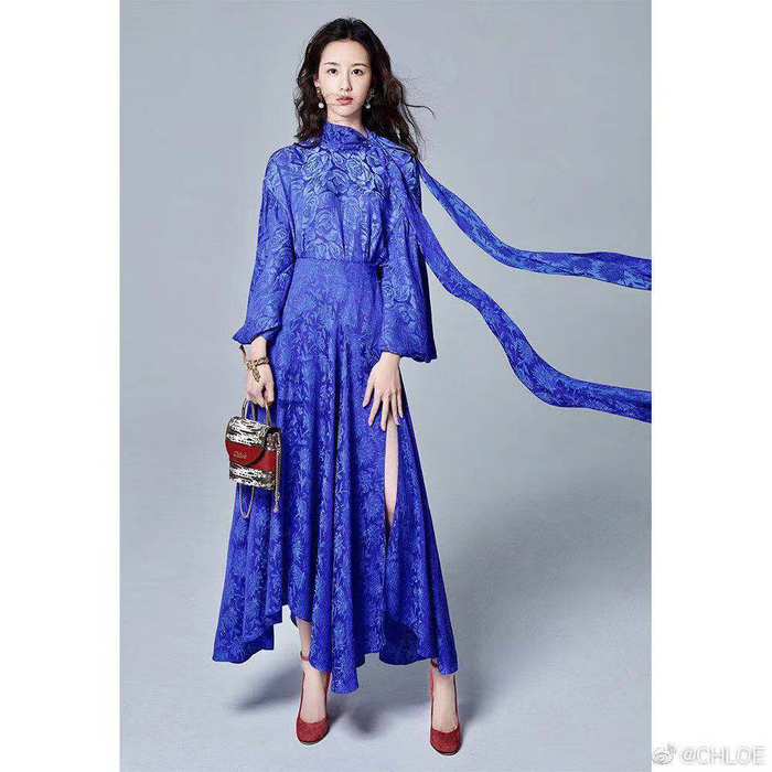 陈都灵身着CHLOE 2019秋冬系列飘带连衣裙。图片来源/CHLOE官方微博截图