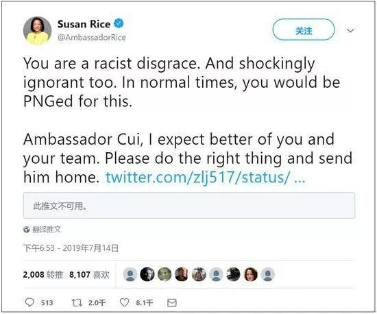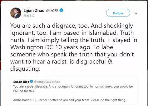 赵立坚7月15日发推特,称赖斯“可耻”与“无知”,自己常驻巴基斯坦首都伊斯兰堡,并不属于中国驻美大使馆,只不过10年前曾在华盛顿居住而已。他还表示赖斯将自己不认同的言论诋毁为“种族歧视”是“可耻与恶心”的。