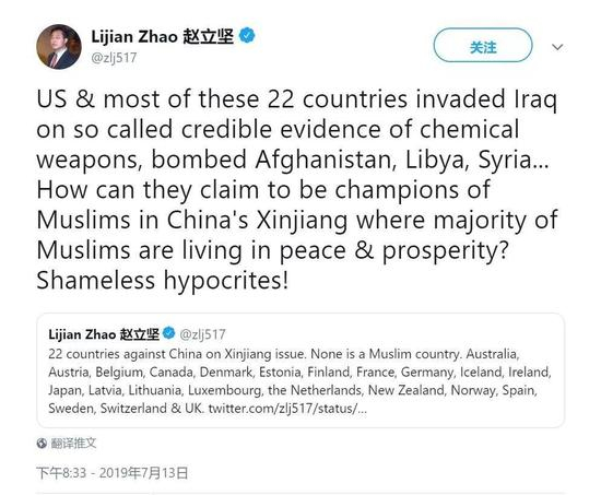 事情原委是这样的——7月13日,赵立坚通过推特呼应37国对中国新疆治理的支持,批评西方22国对中国新疆政策的抹黑。