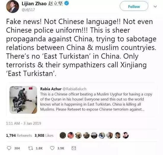 他首先表示,视频中的人说的根本不是中文,穿的也根本不是中国执法人员的服装,中国根本没有“东突厥斯坦”这个地方,只有恐怖分子和他们的同情者才会把新疆说成是所谓的“东突”。