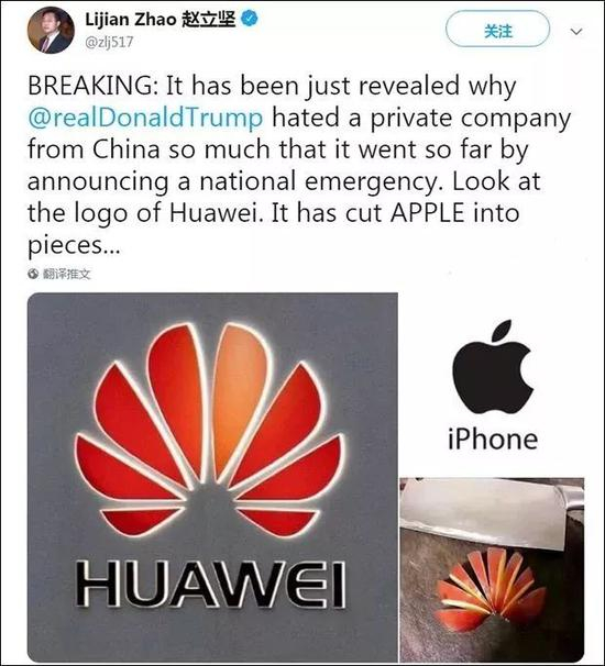 今年5月21日,赵立坚在推特上发布了一张“苹果被切成片”的照片。他开玩笑说:“突发新闻:特朗普这么痛恨一家中国民营企业的原因揭晓了。看看华为的标识。它把苹果切成了碎片……”