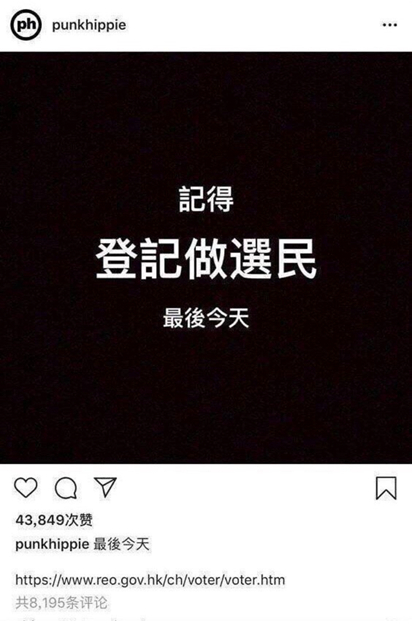 爆料还称,他曾于今年7月初在Instagram上发文:“记得登记做选民,最后今天”。网友提到,这被认为是香港反对派喜欢采用的“黑底白字”风格,以此彰显 “不同”。↓