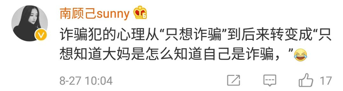对此,网友纷纷给大妈的防骗意识点赞,“骗子都无话可说了”,“你大妈还是你大妈” ;还有网友认为,“这说明北京防诈骗宣传做得很到位”;也有人觉得, “如果各个地区都加强防骗宣传”,“所有大爷大妈都能这样保持清醒就好了”。