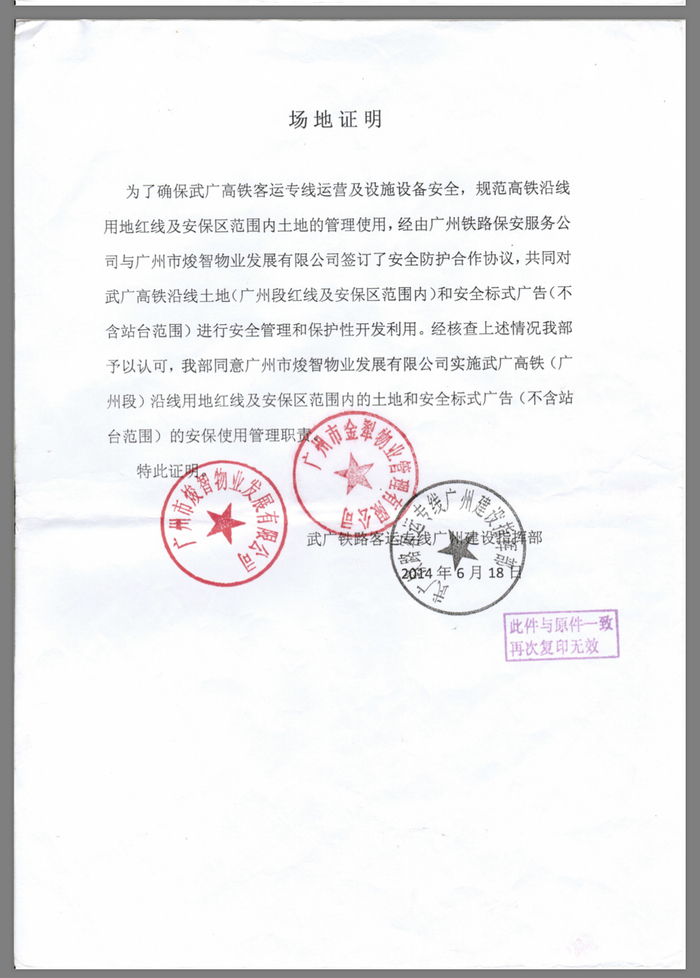 这份时间为2014年6月18日的《场地证明》称:为保障武广高铁客运专线运营及设施设备安全,规范高铁沿线红线及安保范围内土地的管理使用,经由广州铁路保安服务公司与广州市焌智物业发展有限公司签订安全防护合作协议,共同对武广高铁沿线土地(广州段红线及安保区范围内)和安全标式广告(不含站台范围)进行安全管理和保护性开发利用。经核查上述情况我部予以认可,我部同意广州市焌智物业发展有限公司实施武广高铁(广州段)沿线红线及安保区土地的管理职责。落款单位为武广铁路客运专线广州建设指挥部。