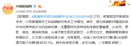原标题:教育部:普通高中语文统编教材古诗文占比近半