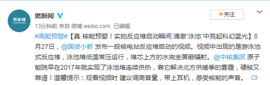 8月27日,@国资小新 发布一段核电站反应堆启动的视频。视频中出现的是游泳池式反应堆,泳池堆低温常压运行,堆芯上方的水完全屏蔽辐射。@中核集团 原子能院早在2017年就实现了泳池堆连续供热,靠它解决北方供暖季的雾霾,硬核又靠谱!温馨提示:观看视频时 建议调高音量,带上耳机,感受核能的声音。