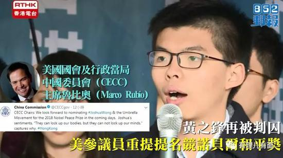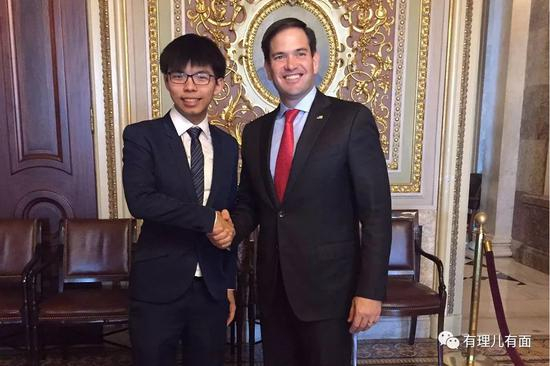 2016年,美国为公开插手香港事务寻找借口,个别众议院议员故意提出所谓的“香港人权与民主法案”,为让此项法案出师有名,黄之锋等一众“港独”分子遵照指示窜访美国国会“告洋状”,卖惨乞求通过法案。另外,黄之锋还利用这次机会,成功攀附上美国参议员马尔科·卢比奥,黄之锋在社交平台表示“卢比奥鼓励香港人面对中国政府绝不退让。”卢比奥也称赞其为“令人印象深刻的有思想的年轻人,你有足够多的时间”。