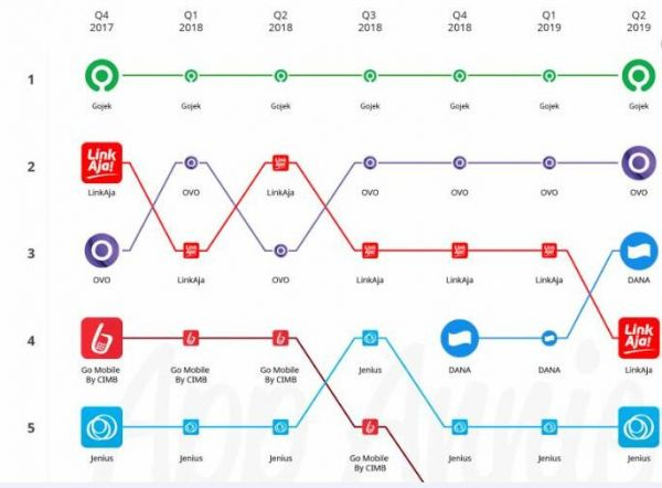 第三方市场研究公司iPrice Group和美国安亿致用公司(App Annie)上周发布了2019年第二季度印尼电子钱包排名。以月活跃用户数来看,获得支付宝技术和经验支持的DANA快速崛起,超过与印尼多家国有银行合作的LinkAja,位居第三。前两名仍分别为来自印尼网约车巨头GoJek的GoPay,以及与东南亚另一大网约车平台——马来西亚格拉布出租车公司(Grab)密切合作的OVO。