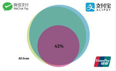 据调查报告显示,在这些用户中,有86%同时使用支付宝和微信支付。45%调查受访者表示,自己还使用银联的移动支付服务。在所有受访者中,有43%同时使用银联和微信支付,有44%同时使用银联和支付宝。