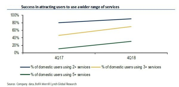 梁伟亮认为,支付宝庞大而稳定的市场份额使其能专注于提升用户参与度。美银美林的数据显示,超过80%的支付宝用户目前使用应用中的多种服务。超过60%使用至少3款服务,而超过20%的人使用5种或更多服务。与一年前相比,支付宝各项服务的使用量正在全面提升。