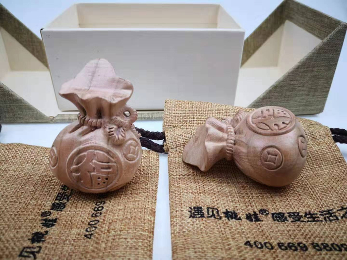 活灵活现的小猴子、精巧可爱的福袋儿、精美的动物形象纸巾盒……想要雕出一件精美的工艺品也绝对不是件简单的事儿,只是相较小提琴制作,桃木工艺品制作简单些而已。为了帮助低收入农户尽早上手,熊宇金聘请了专门的桃木工艺制作非遗老师和专业设计师为村民培训,经过严格的定期培训、入户培训、提升培训后村民才能上手制作。“我们负责把从桃农那里买来的桃树枝进行粗加工,然后再交给村民进行手工雕刻、打磨,销售也是我们来负责。” 熊宇金说。