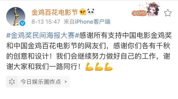 不久后,金鸡百花电影节的官方微博给予了回应,感谢了支持电影节的网友,感谢了大家的创意和设计。目前,官方的海报还未揭晓,让我们一起期待吧!