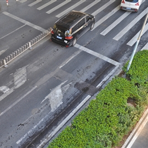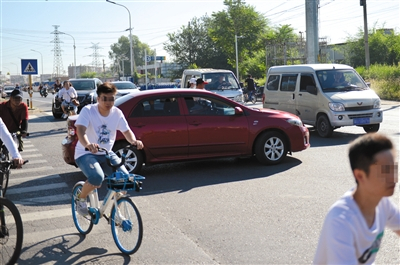 此外,不时有电动车、摩托车在机动车流中穿梭或逆行,机动车也要不时停下避让。由于该路口没有设置人行横道及信号灯,行人经过时,只能在车流中穿梭,左顾右盼避车、等车,在车少时快步前进。