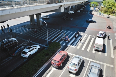新京报记者注意到,右侧一些车辆往左前方“加塞”到直行车流中,有的连并多条道,导致后方车辆不得不放缓车速,鸣笛声也此起彼伏。此外,一些直行的自行车、电动车也向左前方行驶,与机动车混在一块。