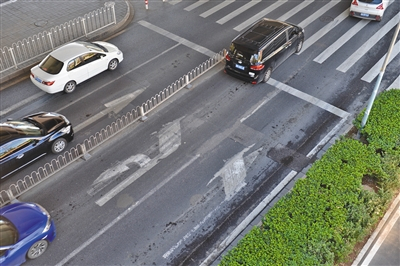 西直门外大街主路也存在类似情况,在主路与辅路汇车处。原本三条车道的路,因为车道西侧出口处划出了一块隔离线,变成了两条车道。记者观察发现,在此会车处,车流量大,因为车道突然变窄,最外侧车道的车想要继续沿主路行驶,必须向左侧并线。一些车辆不得不“加塞”并线,引起车辆抢行,鸣笛声不断。出租车司机谢先生称,这个会车处因为道路突然变窄,多次发生事故。“只要有车在这地方剐蹭了,西二环能堵一半。”他称,希望能把隔离线的位置向辅路再移一些,能够尽量保持三车道行驶。