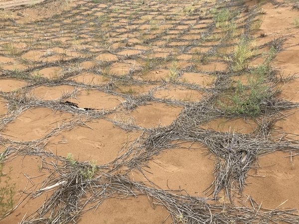 麦草方格和长在“沙结皮”上的花棒、柠条等植物(吴咏玲 摄)