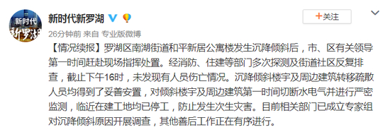 罗湖区南湖街道和平新居公寓楼发生沉降倾斜后,市、区有关领导第一时间赶赴现场指挥处置。经消防、住建等部门多次探测及街道社区反复排查,截止下午16时,未发现有人员伤亡情况。沉降倾斜楼宇及周边建筑转移疏散人员均得到了妥善安置,对倾斜楼宇及周边建筑第一时间切断水电气并进行严密监测,临近在建工地均已停工,防止发生次生灾害。目前相关部门已成立专家组对沉降倾斜原因开展调查,其他善后工作正在有序进行。