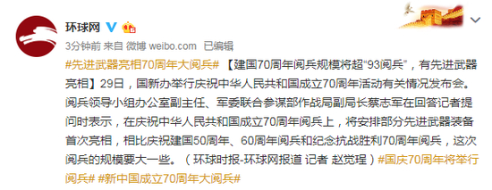原标题:建国70周年阅兵规模将超“93阅兵”,有新武器亮相