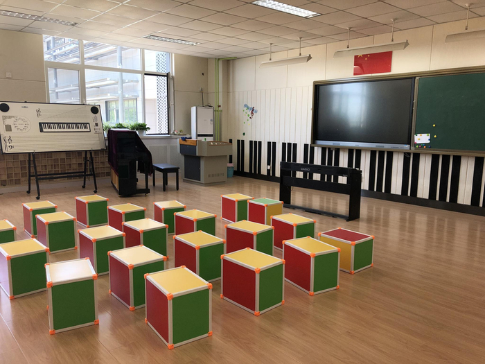 二至四层为教室和办公空间,楼道里还设有直饮水、观赏鱼缸等配套设施。在二层,8个功能类教室尤为亮眼,包括音乐教室、科技教室、美术教室等,以及“少年创新工作坊”。张磊介绍,这个工作坊将基于大学的科技类社团,由大学生带小学生做科技项目,如动手制作机器人。