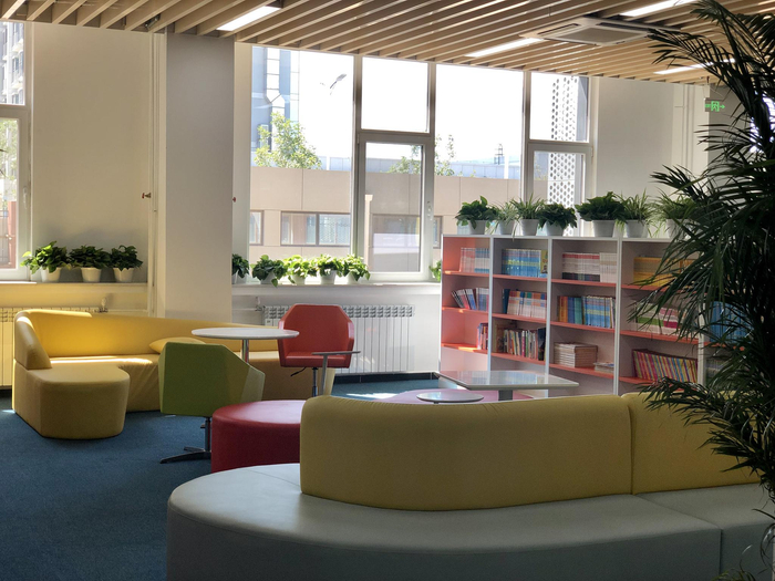 记者在现场看到,小学部、初中部、综合楼和师生宿舍四幢灰色建筑均已完工。走进小学部,内部空间的色彩一下亮丽起来。一层公共活动空间设有一片约500平米的开放式图书大厅,一排排小书架上摆满了书籍,一旁设有造型活泼的沙发座位。