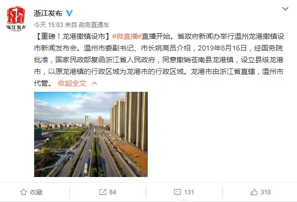 继多地“撤县设市”后,现在,“镇设市”也来了。浙江一个镇级行政单位成功升级为县级市!