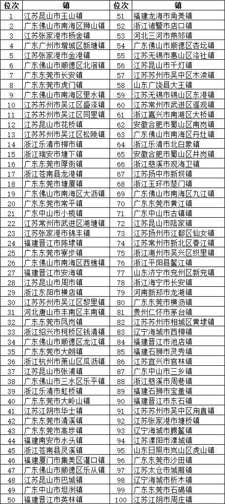 上表来源于中小城市发展战略研究院等机构2018年10月发布的《中国中小城市绿皮书》。可以看出,百强镇由广东、江苏、浙江、福建四地霸榜,其中广东占据31席,主要分布于东莞、佛山和中山;江苏占据30席,主要分布于苏州、无锡;浙江占据17席,福建占据10席。