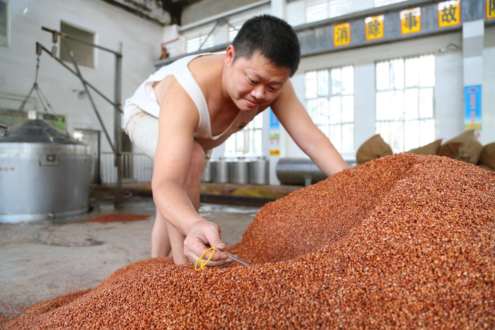 酒师在测量高粱温度。