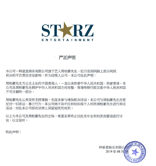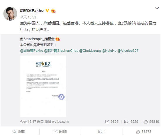 26日,一条“#周柏豪声明#”的话题迅速占据微博热搜第一位。当天下午4时53分,周柏豪在其官方微博@周柏豪Pakho发布的一段声明,澄清自己从未支持港独。