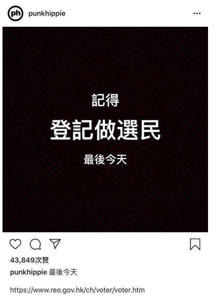 爆料还称,他曾于今年7月初在Instagram上发文:“记得登记做选民,最后今天”。网友提到,这被认为是香港反对派喜欢采用的“黑底白字”风格,以此彰显 “不同”。↓
