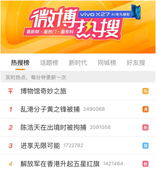 值得注意的是,今天(30日)一早,“#乱港分子黄之峰被捕#”的话题也一度登上微博热搜榜,占据第一位。↓