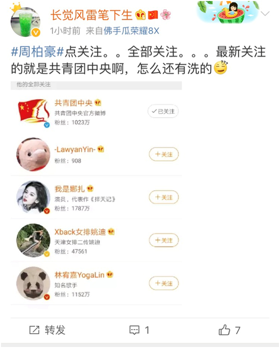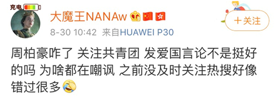 所以,对于今天周柏豪被爆出“突然”关注共青团中央官方微博的消息,网友才用了以上嘲讽的语气对其调侃。
