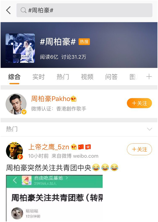 [环球网报道 记者 王博雅琪]时隔4天,曾因发布“从未支持港独”声明而登上微博热搜榜的香港艺人周柏豪今日再次登榜。这一次,是因为他关注了共青团中央的官方微博账号“@共青团中央”。