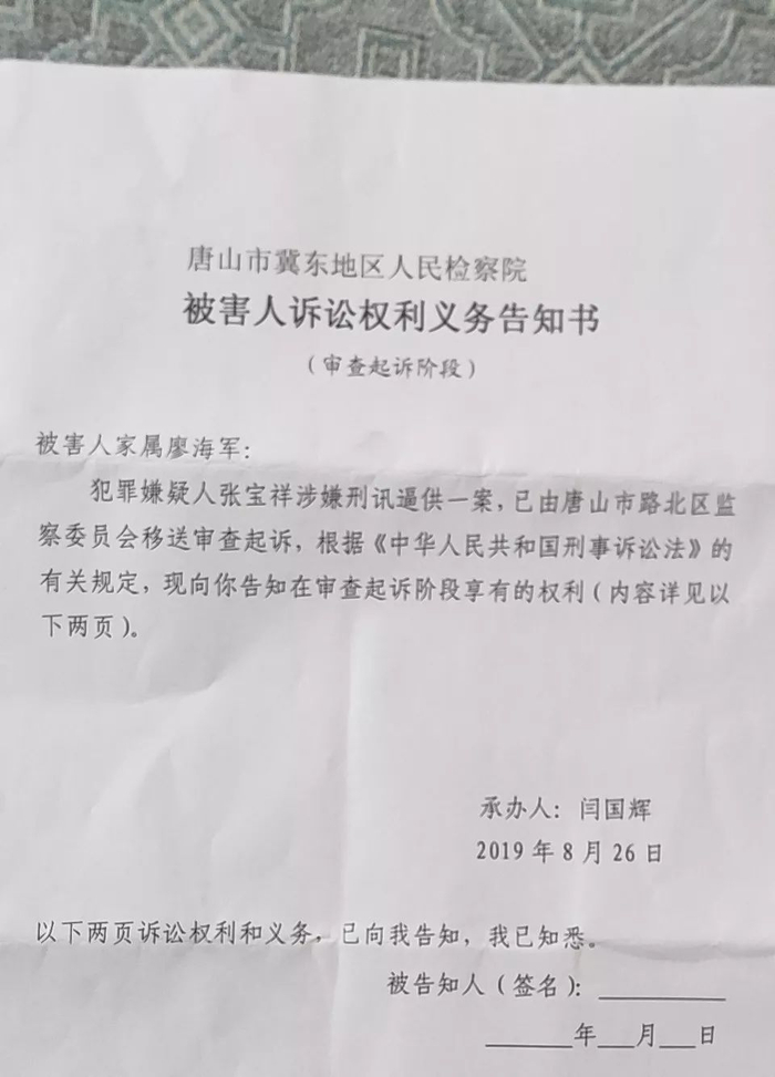 值得注意的是,廖海军此番以“被害人家属”的身份收到诉讼权利义务通知书,追究的是民警张宝祥对其父亲廖友刑讯逼供的法律责任。另据媒体报道,张宝祥还是廖友的同学。