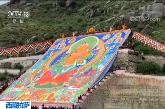 8月30号早上九点,位于拉萨西郊的哲蚌寺举行了盛大的展佛活动,僧人们从展佛台顶部缓缓展开这幅强巴佛巨幅唐卡,它长约42米,宽40米,造型精美、十分庄严。四周的信众们环绕唐卡行进,不断地抛献哈达,祈求平安幸福,风调雨顺。哲蚌寺展佛,也拉开了为期7天的拉萨雪顿节序幕。今年的拉萨雪顿节从8月30日到9月5日,将持续一周。节日期间,除了传统的展佛外,最吸引藏族百姓的要属藏戏展演了。