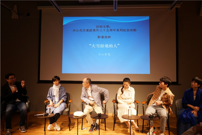 木心影像映后交流现场。从左至右依次为:主持人刘道一、导演谢梦茜、陈子善、桑格格、绿妖。