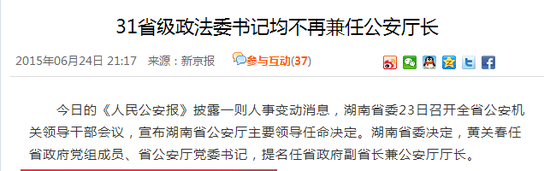 在2015年时有媒体注意到, 31个省级政法委书记均不再兼任公安厅长。