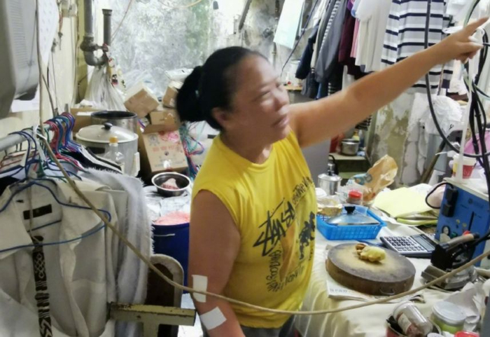 在楼下碰到一位正在工作的大姐,她的工作间像是个很乱的洗衣房。她说自己姓李,40年前从广东中山移民香港,如今有两个孩子,一儿一女,都没有结婚,没有房子住是主要原因。她说她的家住的是公屋(就是政府提供的廉租房),约29平米。她说,小孩子们闹游行她很不喜欢,但他们心里有气。