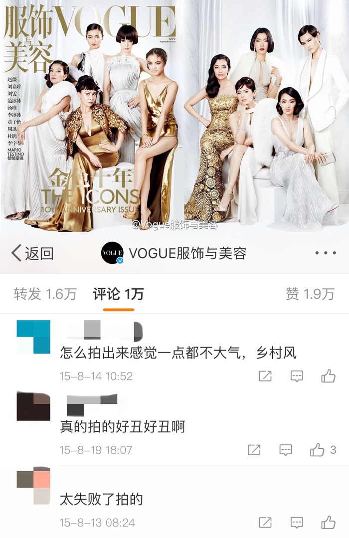VOGUE在“金九”战场上被众网友“群嘲”已不是第一次。早在2015年,VOGUE为庆祝创刊十周年,聚齐了十位一线女星为其拍摄“金色十年”主题封面,但却并未得到网友的赞誉,甚至有人直言:太失败了,欣赏不来。