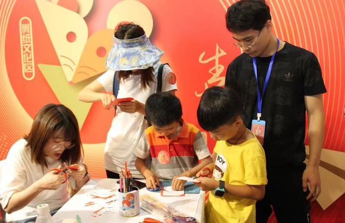 糖画展台旁是剪纸体验区,京派剪纸传承人曹璐一边指导体验者剪纸,一边讲述剪纸背后的传统文化。她说,“善”与“爱”才是中华剪纸的精髓,好的剪纸总是和温暖的回忆相关,总是有着浓郁的中国人文气息。