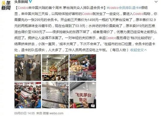 [Costco来中国大陆的首个周末 茅台消失众人排队退会员卡]#costco会员排队退卡#很明显,来中国大陆三天后,以购物体验好著称的Costco就发生了一些变化,要进入Costco购物,你需要先办一张299元的会员卡。开业前三天售价为1498元一瓶的飞天茅台没有了,原本售价32.9元的两瓶装味全冷藏牛奶,现在也调到了53.9元;水井坊的特价酒卖完了,原本卖919元的五粮液也调价至1069元了——很多抢破头的东西下架了,或者是调价了,优惠力度已经没有之前那么疯狂了。