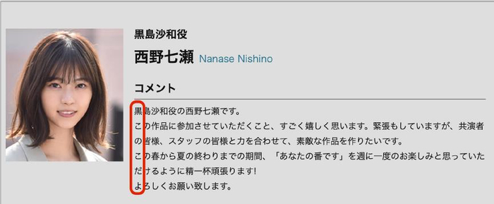 官方在网站上放出的角色说明里,黑岛沙和的扮演者西野七濑的介绍段落中,每句的第一个字连在一起恰巧可以译为:“黑幕是这个人哟”。