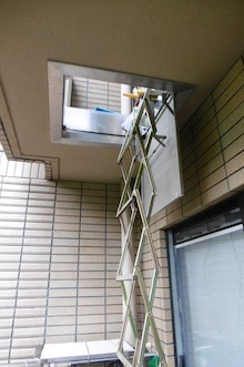 公寓原型与剧中的设定在外观上稍有差距,不过最重要的内部构造——避难梯的位置却是一致的。由此才可以使住户间不经过楼梯与电梯,从阳台即可互通的犯案手法得到实现。