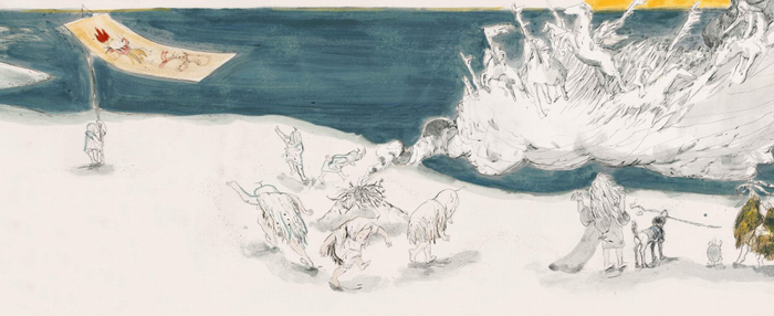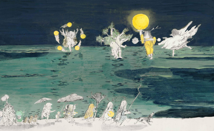 用什么样的风格去做,同样是熊亮需要考虑的问题。在回到绘画之后,熊亮讲述了这部作品当中的中国审美:一个是艺术风格,第二个是所有的古典想象。虽然这些古典想象都藏身于文字当中,但熊亮用图像将它们找了出来,同时也展现了各种瑰丽繁复的场景,比如迎神仪式的出生场景、仙鹤舞,以及楚文化中各种各样有趣的东西等。