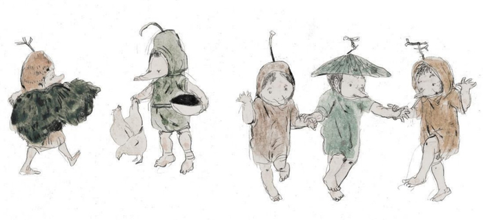 《游侠小木客》系列插图。木客从头到脚都穿着植物纤维编织的连帽套衫,帽子顶部有一个木梗装饰。他们的手指非常粗长,有点像擅于攀爬的猴子。