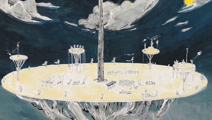 《游侠小木客》系列插图。位于家树最上方的观天台上的庆生仪式。观天台是木客们平时登高拜月仪式的天台,是整个桃花源的制高点。